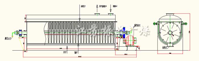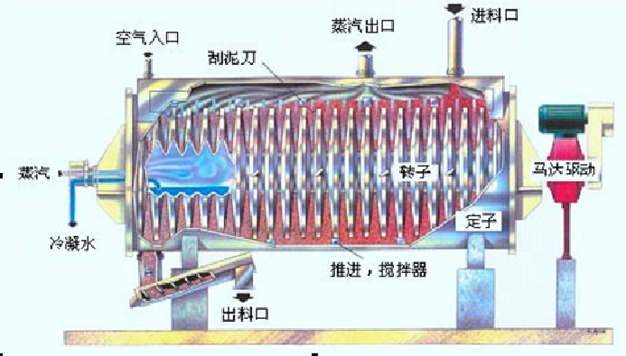 空心軸上密集排列著中空?qǐng)A盤片,振干以熱傳導(dǎo)為主要手段的干燥器,依靠葉片、主軸或熱壁的熱量與污泥顆粒的接觸、攪拌擠壓進(jìn)行換熱,其中的熱量來自填充在其中的熱介質(zhì),熱介質(zhì)經(jīng)空心軸流經(jīng)圓盤片。單位有效容積內(nèi)傳熱面積很大,熱介質(zhì)溫度從-40℃到320℃,可以是水蒸汽,也可以是液體型:如熱水、導(dǎo)熱油等。間接傳導(dǎo)加熱,沒有攜帶空氣帶走熱量,熱量均用來加熱物料。熱量損失僅為通過器體保溫層向環(huán)境的散熱。