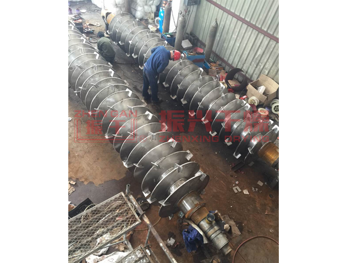 1) 根據(jù)污泥特性及工藝要求,a.振興干燥為防止?jié)窨諝庠趫A盤干燥機(jī)內(nèi)及在排風(fēng)管內(nèi)冷凝結(jié)露,要求在干燥機(jī)進(jìn)風(fēng)口設(shè)空氣換熱器將空氣預(yù)熱后進(jìn)入。 B. 振干為防止物料被擠入密封填料內(nèi)對(duì)主軸產(chǎn)生摩擦而破壞主軸表面光潔度而造成對(duì)填料的快速磨損,導(dǎo)致密封效果不好漏粉,設(shè)備制造過程中除了要確保制作精度(主軸與密封箱的同心度,端蓋與軸的垂直度等)外,要求在二端設(shè)置反向推料螺旋片讓箱體內(nèi)的物料不在端蓋處對(duì)軸封產(chǎn)生擠壓。