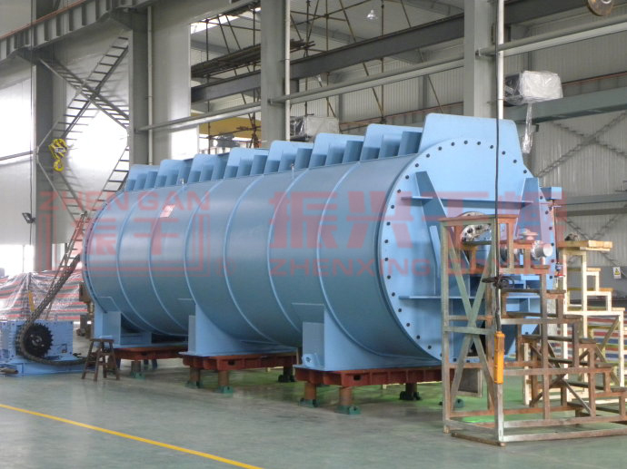 空心軸上密集排列著中空?qǐng)A盤片,振干以熱傳導(dǎo)為主要手段的干燥器,依靠葉片、主軸或熱壁的熱量與污泥顆粒的接觸、攪拌擠壓進(jìn)行換熱,其中的熱量來(lái)自填充在其中的熱介質(zhì),熱介質(zhì)經(jīng)空心軸流經(jīng)圓盤片。單位有效容積內(nèi)傳熱面積很大,熱介質(zhì)溫度從-40℃到320℃,可以是水蒸汽,也可以是液體型:如熱水、導(dǎo)熱油等。間接傳導(dǎo)加熱,沒(méi)有攜帶空氣帶走熱量,熱量均用來(lái)加熱物料。熱量損失僅為通過(guò)器體保溫層向環(huán)境的散熱。