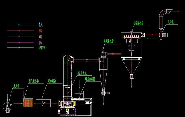 熱空氣由進(jìn)風(fēng)口以適宜的噴動(dòng)速度從干燥機(jī)底部進(jìn)入攪拌粉碎干燥室,對物料強(qiáng)烈的剪切、吹浮、旋轉(zhuǎn)作用,于是物料受到離心、剪切、碰撞、磨擦而被微?;?,強(qiáng)化了傳質(zhì)傳熱。在干燥機(jī)底部,較大較濕顆粒團(tuán)在攪拌器的作用下被機(jī)械破碎,濕含量較低、顆粒度較小的顆粒被旋轉(zhuǎn)氣流夾帶上升,在上升的過程中進(jìn)一步干燥,由于氣固相作旋轉(zhuǎn)流動(dòng),固相慣性大于氣相,固氣兩相間的相對速度較大,強(qiáng)化兩相間的傳熱效果,所以該機(jī)干燥強(qiáng)度高。