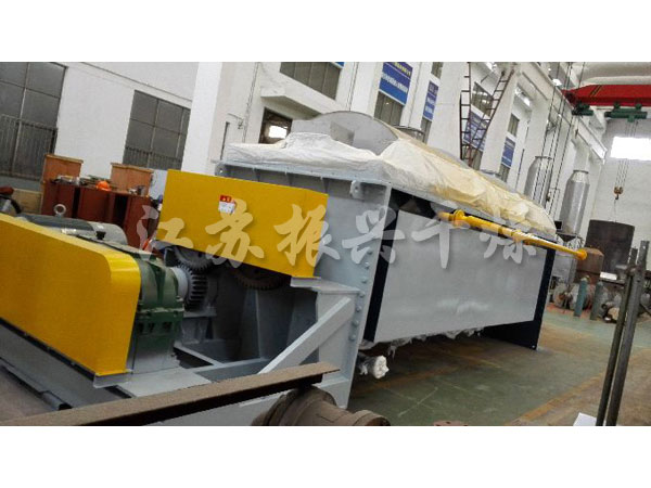 振興干燥研制的槳葉干燥機,空心軸上密集排列 著楔型中空漿葉,熱介質經空心軸流經漿葉。單位有效容積內傳熱面積很 大,熱介質溫度從-40℃到320℃,可以是水蒸汽,也可以是液體型:如熱 水、導熱油等。間接傳導加熱,沒有攜帶空氣帶走熱量,熱量均用來加熱 物料。熱量損失僅為通過器體保溫層向環(huán)境的散熱。楔型漿葉傳熱面具有 自清潔功能。物料顆粒與楔型面的相對運動產生洗刷作用,能夠洗刷掉楔 型面上附著物料,使運轉中一直保持著清潔的傳熱面。漿葉干燥機的殼體 為Ω型,殼體內一般安排二到四根空心攪拌軸。殼體有密封端蓋與上 蓋,防止物料粉塵外泄而充分發(fā)揮作用。