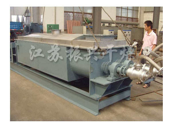振興干燥研制的槳葉干燥機,空心軸上密集排列 著楔型中空漿葉,熱介質(zhì)經(jīng)空心軸流經(jīng)漿葉。單位有效容積內(nèi)傳熱面積很 大,熱介質(zhì)溫度從-40℃到320℃,可以是水蒸汽,也可以是液體型:如熱 水、導(dǎo)熱油等。間接傳導(dǎo)加熱,沒有攜帶空氣帶走熱量,熱量均用來加熱 物料。熱量損失僅為通過器體保溫層向環(huán)境的散熱。楔型漿葉傳熱面具有 自清潔功能。物料顆粒與楔型面的相對運動產(chǎn)生洗刷作用,能夠洗刷掉楔 型面上附著物料,使運轉(zhuǎn)中一直保持著清潔的傳熱面。漿葉干燥機的殼體 為Ω型,殼體內(nèi)一般安排二到四根空心攪拌軸。殼體有密封端蓋與上 蓋,防止物料粉塵外泄而充分發(fā)揮作用。